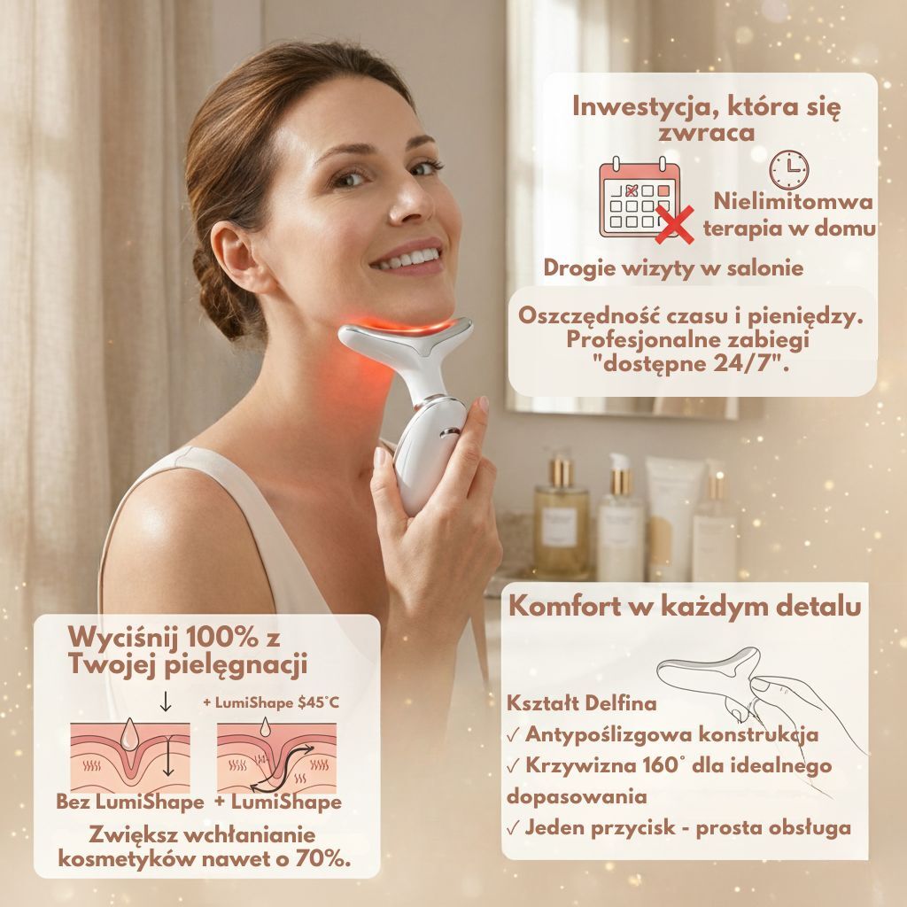 Regularne stosowanie LumiShape™ już przez kilka tygodni wystarczyło, aby widocznie wygładzić zmarszczki na szyi, poprawić napięcie skóry i podkreślić owal twarzy. Efekty, które widzisz na zdjęciach, to rezultat systematycznej, codziennej pielęgnacji w domu.