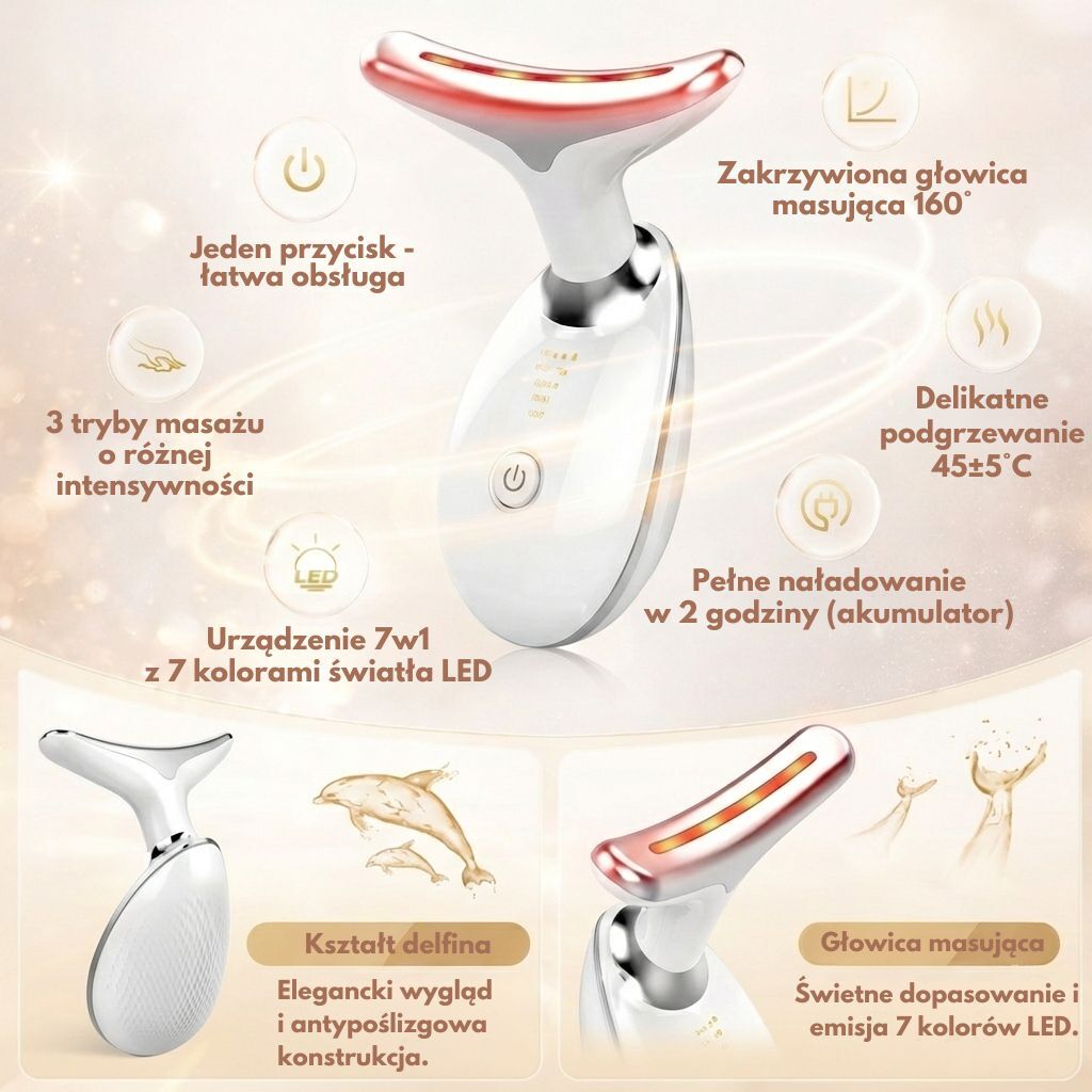 Dzięki technologii światła LED LumiShape™ działa w głębszych warstwach skóry, pobudzając naturalną produkcję kolagenu i elastyny. To właśnie one odpowiadają za widoczne wygładzenie zmarszczek, poprawę jędrności oraz przywrócenie napięcia skóry w okolicy szyi i podbródka.
